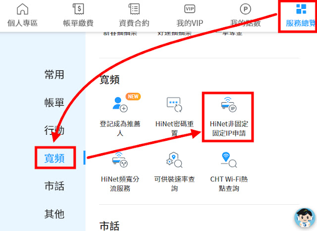 服務總覽 → 寬頻 → HiNet 非固定固定 IP 申請